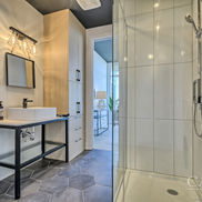 Salle de bain élégante où le marbre grand format enveloppe l’espace et crée une ambiance lumineuse et raffinée. Le meuble double vasque suspendu et la douche vitrée accentuent le style contemporain et la sensation de luxe du penthouse.