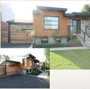 Cuisine aux lignes épurées mariant armoires laquées blanches, bois foncé et acier inoxydable, dans un style contemporain. Les étagères ouvertes et les accents décoratifs évoquent subtilement le design mid-century, apportant chaleur et caractère à l’ensemble.